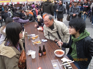 前日の12日に始まった春節祭2日目の午前11時から、日中県連ブース斜め前のテーブルを囲んでの交流会。快晴に恵まれて、昼食の時間帯とあって広場は大変な賑わいぶりでした。